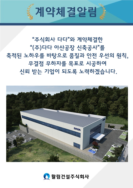 수집된 일부 개인정보는 활림건설(주)의 DB에 보유되며 당사의 보다 정확한 서비스제공에 이용됩니다. 접수된 내용에 대한 삭제를 원하실 경우 언제든지 연락주시면 삭제 합니다.